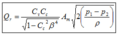 The real flow can be obtained by multiplying the ideal flow by a coefficient of correction Cv. This coefficient includes the corrections related to loss of energy between points 1 and 2, between which the pressure differential is obtained. This differential partly comes from the drainage accelaration and partly from the loss of load. The latter always acts aiming at increasing the differential, reason why the Cv value is always inferior to that of the unit. So, taking into account these correction and the Am meter area, the equation for the flow is given by: